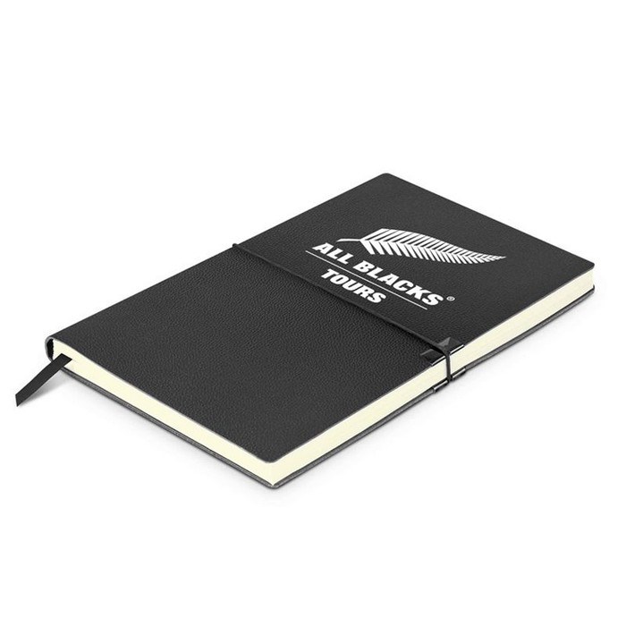 Smart medium-sized notebook with 80 leaves (160 pages) of 80gsm lined cream paper and a soft leather-look PU cover. It also features a bookmark ribbon and an elastic closure band that is secured by smart metal tabs on the cover.